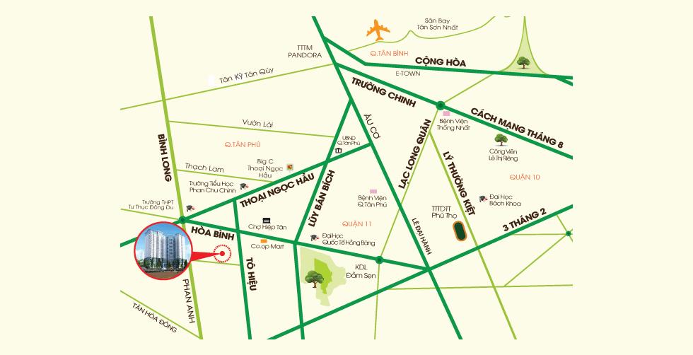 - Dự án nằm cách Trung tâm văn hóa Đầm Sen chỉ 5 phút theo đường Hòa Bình. Gần UBND quận Tân Phú và tuyến Metro số 2, 6.