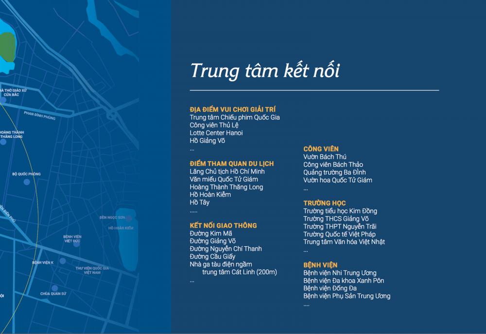 Khu vực quanh dự án cũng được đồng bộ cơ sở hạ tầng hiện đại và là một trong những khu vực sầm uất bậc nhất Thủ đô nên trong vòng bán kính vài km từ dự án, cư dân có thể tìm thấy những tiện íchcần thiết cho cuộc sống hiện đại của mình gồm cáctrung tâm hành chính, chính trị,đại sứ quán, ga tàu điện ngầm sẽ hình thành trong tương lai, khu di tích Chủ tịnh Hồ Chí Minh, Văn miếu Quốc Tử Giám,Khách sạn Deawoo, Lotte Center…