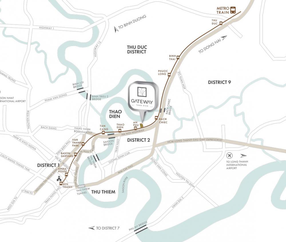 Dự án Gateway Thảo Điền tọa lạc ngay trung tâm Thảo Điền, mặt tiền Xa lộ Hà Nội với 3 mặt giáp sông và nằm liền kề trạm Metro An Phú (ga số 7). Giao thông tại dự án vô cùng thuận lợi, hạ hoàn thiện cùng cảnh quan thiên nhiêu xanh mát... đã góp phần tô điểm cho chung cư trởthành nơi đáng sống bậc nhất Sài Gòn.