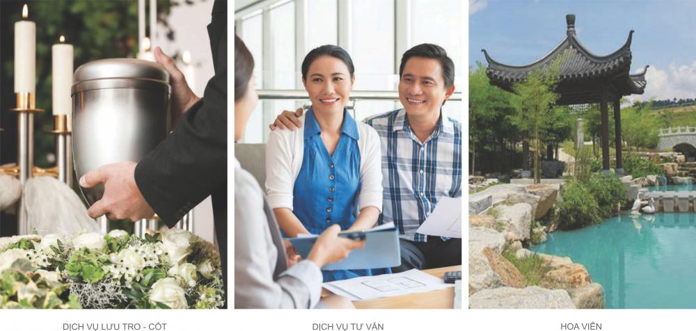 Không chỉ là hoa viên đầu tiên và duy nhất tại Việt Nam sử dụng công nghệ Bim hiện đại của Mỹ, dự án còn sở hữu hệ thống tiện ích cao cấp đáp ứng đa dạng nhu cầu của khách hàng vớinhà lưu trú cho thân nhân, thiền Viện,nhà tang lễ, đền Trình, nhà hỏa táng,hồ Tịnh Tâm, bãi đá Thiêng, nhà chờ xe Buggy, đồi Tự Tại,xưởng sản xuất bia mộ,... Kèm theo đó làchuỗi dịch vụ tổ chức tang lễ, dịch vụ lưu tro cốt, hỏa táng, bản tin cáo phó, tổ chức nghi lễ tôn giáo,tôn tạo cảnh quan, chăm sóc phần mộ...