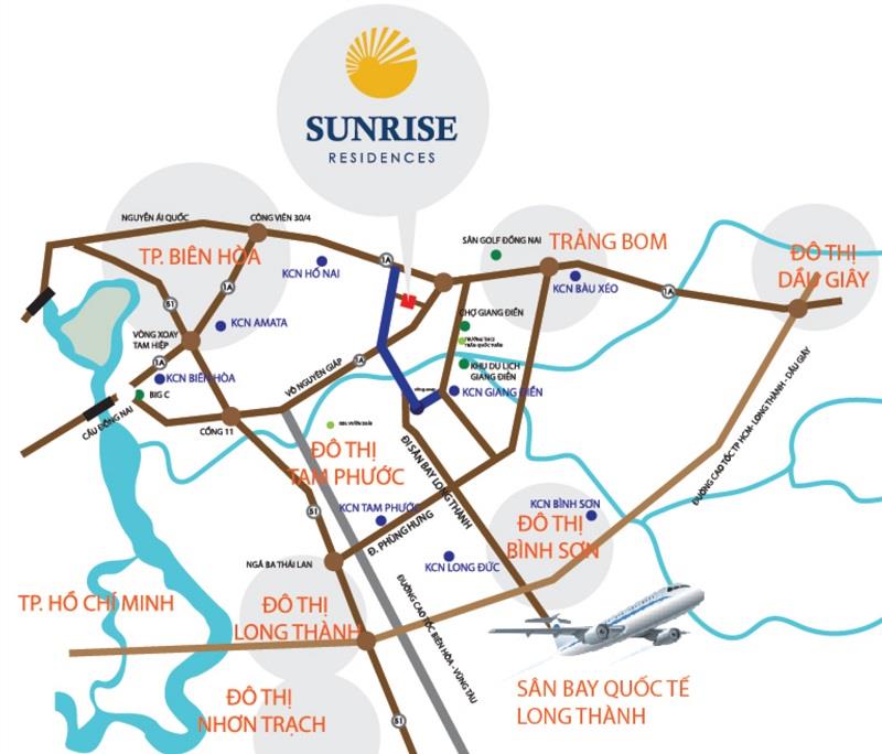 Dự án Sunrise Residences tọa lạc tại xã Bình Minh, Trảng Bom, Đồng Nai, gần đường Võ Nguyên Giáp và Quốc lộ 1A. Từ dự án, cư dân chỉ mất 5-10 phút là tới các tiện ích thông qua những tuyến đường lớn như Võ Nguyên Giáp, Quốc lộ 1A, tuyến đường Bắc Hòa - Phú Sơn đi sân bay Quốc tế Long Thành.