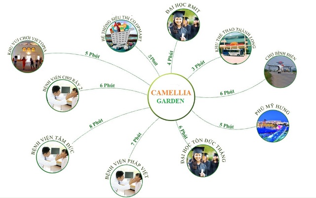 Khu dân cư Camellia Garden được xây dựng và quy hoạch trong khu đô thị phía Nam Sài Gòn nên được thừa hưởng vị trí và hạ tầng giao thông hoàn thiện, thuân lợi cho việc di chuyển đến những khu trung tâm thương mại, giải trí, trường học, chợ bệnh viện,... và các tỉnh miền Tây Nam Bộ.