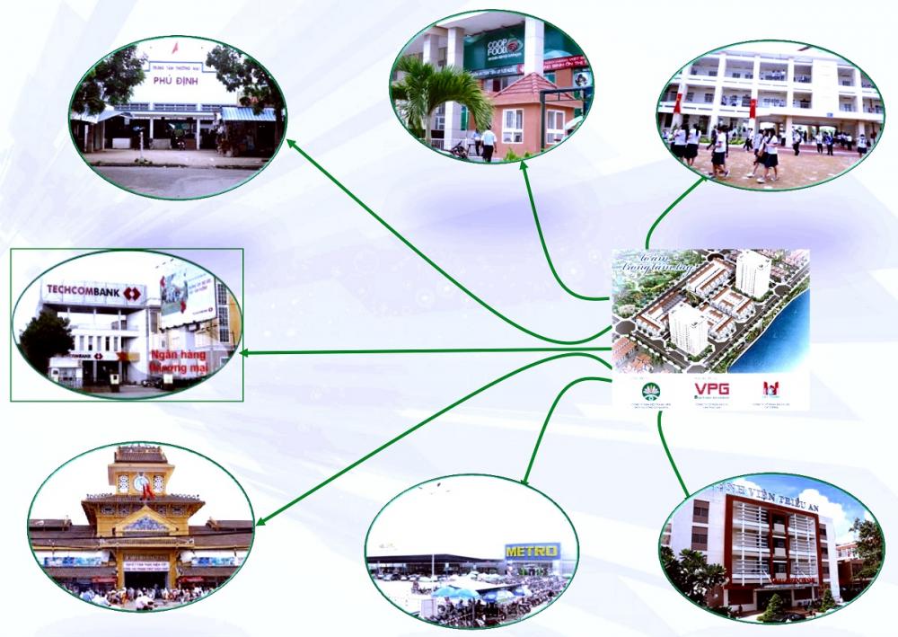 Trong vòng bán kính 1km, cư dân Vhome có thể tận hưởng đầy đủ những tiện ích chính yếu như:cách chợ Phú Định 200m, siêu thị Vinatex Phú Định 300m, Phòng khám Đa Khoa Sùng Đức 1km, trường mẫu giáo Bông Sao 250m, trường THPT Nguyễn Thị Định khoảng 400m, trường THCS Bình Đông 800m, trường Tiểu học Nguyễn Công Trứ - 500m...