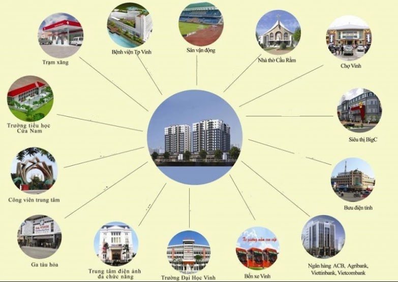 Bên cạnh đó, dự án cũng rất gần với các trung tâm văn hóa - kinh tế - chính trị - cộng đồng như: sân vận động, Quảng trường trung tâm,bệnh viện TP. Vinh, siêu thị BigC,bưu điện tỉnh,Nhà thờ Cầu Rằm, công viên trung tâm…